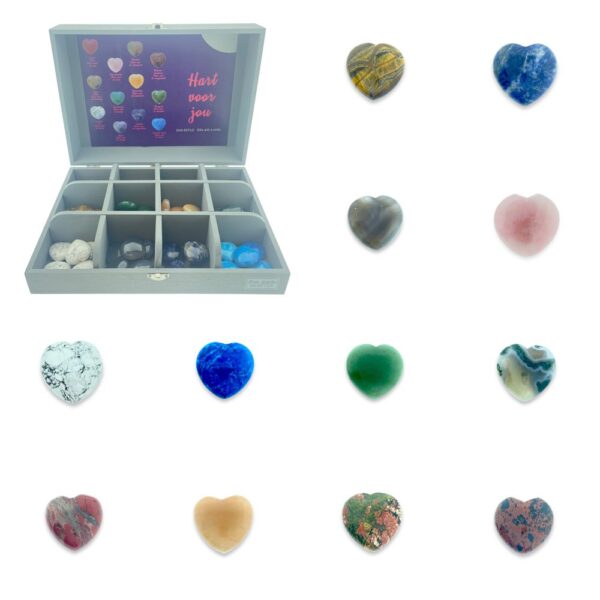 Edelsteen harten 4cm – 1,6cm dik (sterrenbeeld) + edelsteen uitleg – Kist compleet 5×12