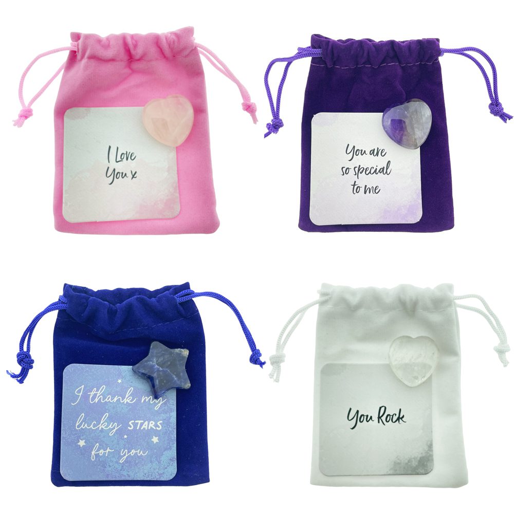 Amethist-, Bergkristal- & Rozenkwarts-hart of Sodaliet-ster in zakje