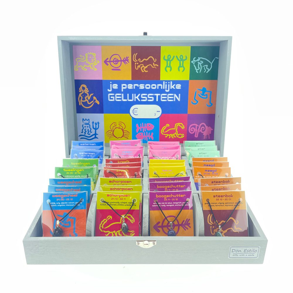 Complete kist 3×12 soorten | Agaat – maagd | Amazoniet – waterman | Amethist – vissen |Aventurijn – kreeft | Bergkristal – leeuw | Hematiet – Schorpioen | Mosagaat – steenbok | Obsidiaan – weegschaal | Rode jaspis – ram | Rozenkwarts – stier | Sodaliet – boogschutter | Tijgeroog – tweeling