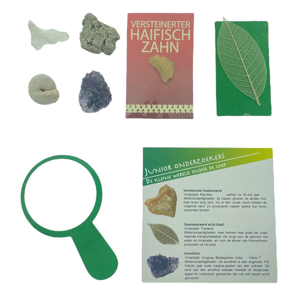 inhoud: vergrootglas,turritella agaat,pyriet,agaat geode,blad,schorpioen
