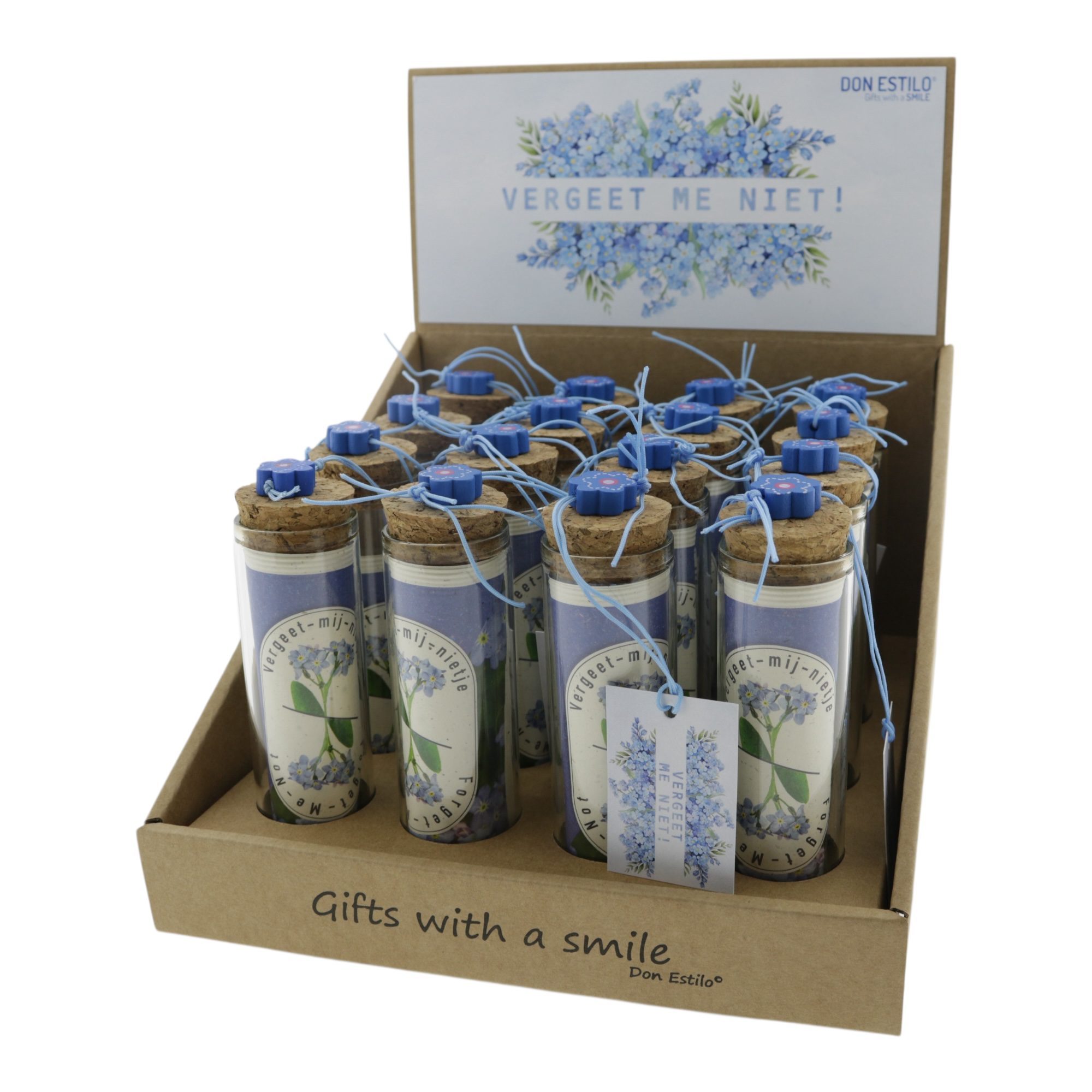 Home Displays Toonbankdisplays Toonbankdisplay (Don Estilo) Groeicadeau Vergeet mij niet in buisje (10x3cm)