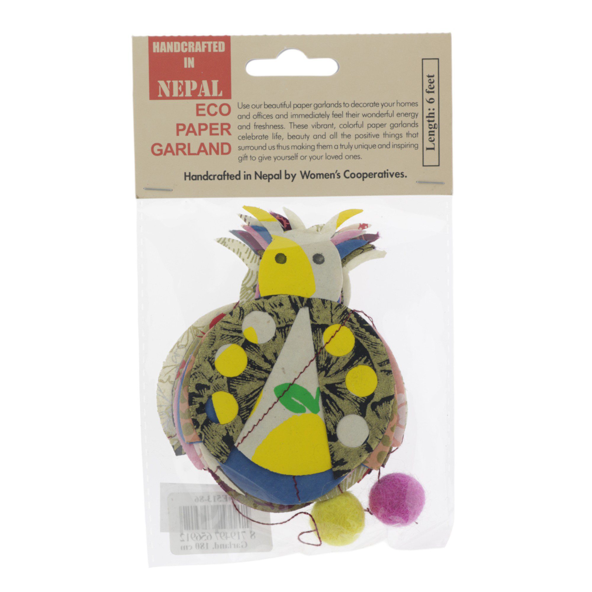 Lokta-papier met verschillende patronen wordt zorgvuldig uitgestanst en met de hand aan elkaar gestikt tot prachtige slingers. Deze slingers zijn fairtrade producten, gemaakt door vrouwencoöperaties met behulp van lokale grondstoffen en restpapier. Hierdoor is elke slinger uniek en bijzonder.