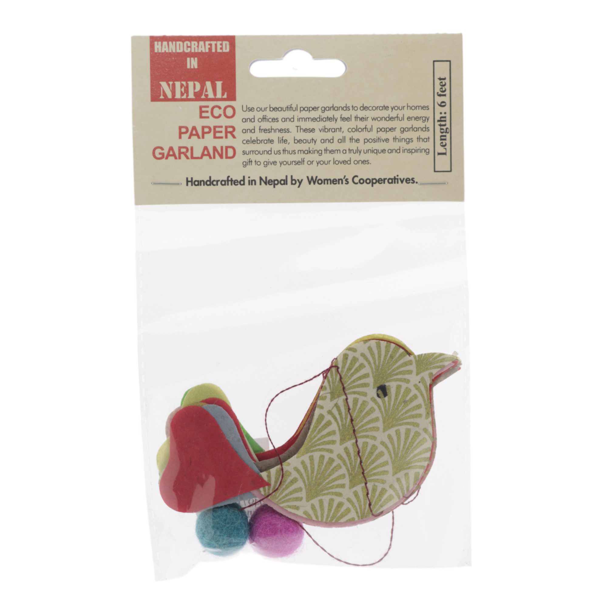 Lokta-papier met verschillende patronen wordt zorgvuldig uitgestanst en met de hand aan elkaar gestikt tot prachtige slingers. Deze slingers zijn fairtrade producten, gemaakt door vrouwencoöperaties met behulp van lokale grondstoffen en restpapier. Hierdoor is elke slinger uniek en bijzonder.