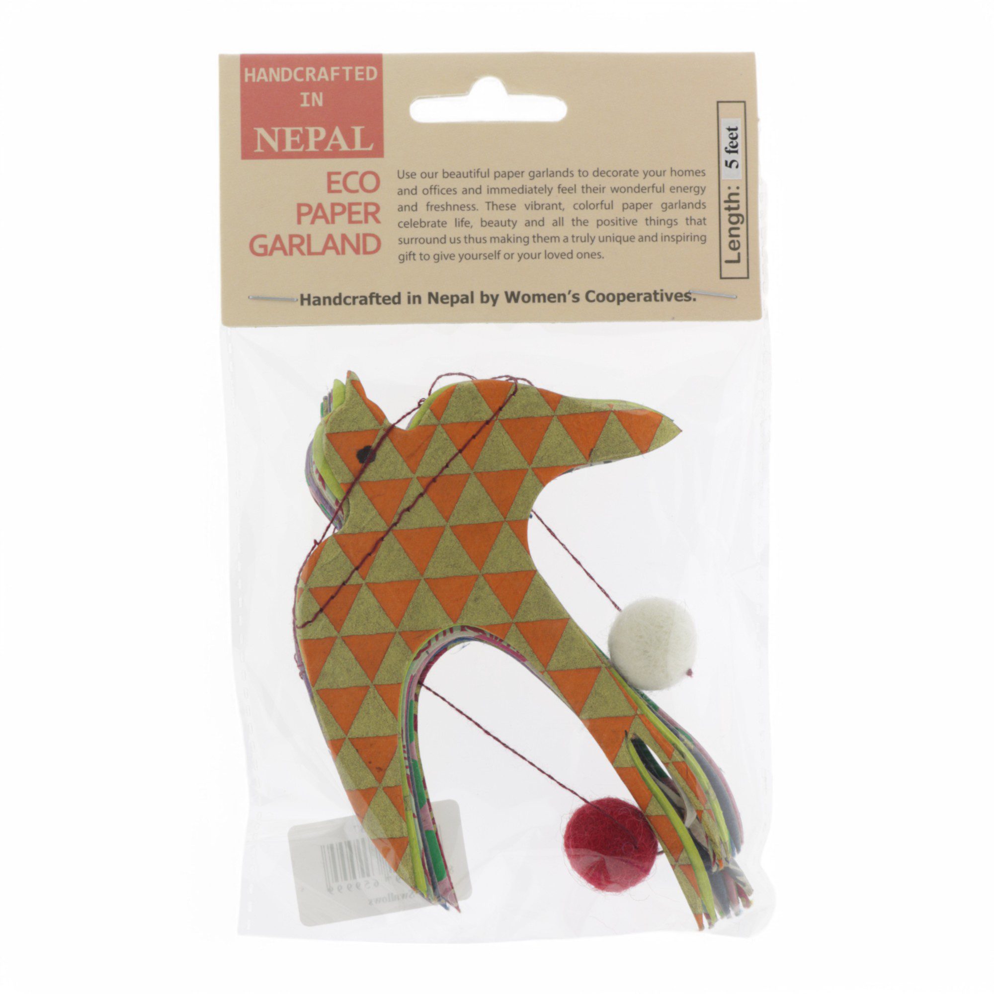 Lokta-papier met verschillende patronen wordt zorgvuldig uitgestanst en met de hand aan elkaar gestikt tot prachtige slingers. Deze slingers zijn fairtrade producten, gemaakt door vrouwencoöperaties met behulp van lokale grondstoffen en restpapier. Hierdoor is elke slinger uniek en bijzonder.